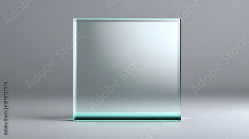 A clear, glass cube-shaped object displayed on a minimalist surface, showcasing its simple, geometric design and reflective properties.