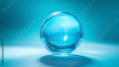 A clear glass sphere resting on a smooth surface with a soft blue background.