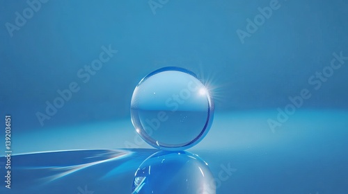 A clear glass sphere with a bright reflection on a blue surface with a gradient background