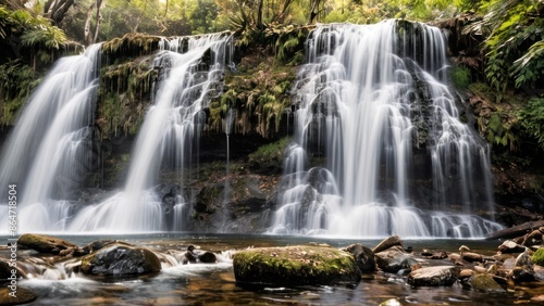 A clear waterfall in a peaceful setting, isolated against a pure white background.