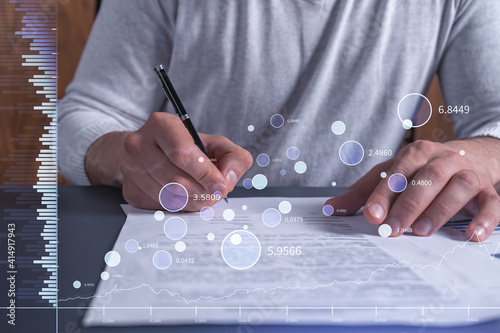 A client in casual wear is signing the contract to invest money in stock market. Internet trading and wealth management concept. Forex and financial hologram chart over the desk.