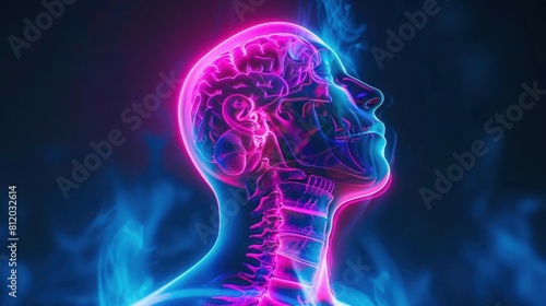 A clinical Xray image of the cervical spine, utilizing synthwave styling with neon lighting to delineate crucial areas that may contribute to migraine headaches