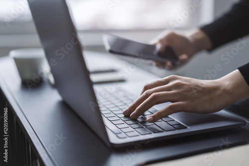 A close observation of a woman's hands actively typing on a sleek laptop keyboard, set against a fuzzy office backdrop