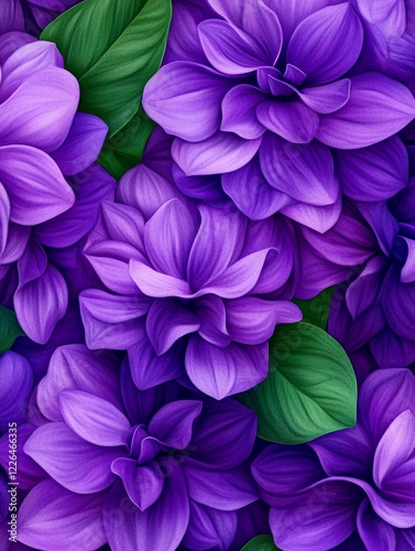 A Close Up Composition of Rich Purple Flower Petals - A vibrant design of lush purple flowers and green leaves symbolizing beauty, nature, elegance, and tranquility.