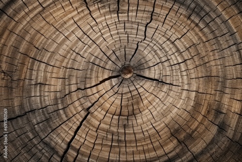 A close up macro texture and pattern of the aged grungy cracked tree trunk wallpaper, brown color and high detailed tree wood, round circle wood body, generated by AI.