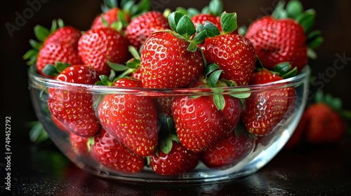 a close up of a bowl of strawberries on a table with other strawberries on the side of the bowl.