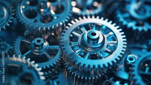 A close up of a bunch of gears with a metallic look. The gears are all different sizes and shapes, but they all have a similar design. Concept of precision and complexity