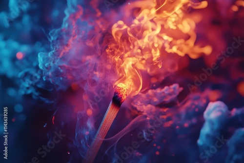 A close up of a burning matchstick with a glowing ember vibrant flames