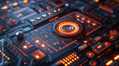 A close up of a circuit board with many glowing lights. The board is orange and he is a part of a computer or electronic device