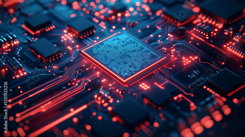 A close up of a computer chip with red and blue lights illuminating the intricate circuit patterns