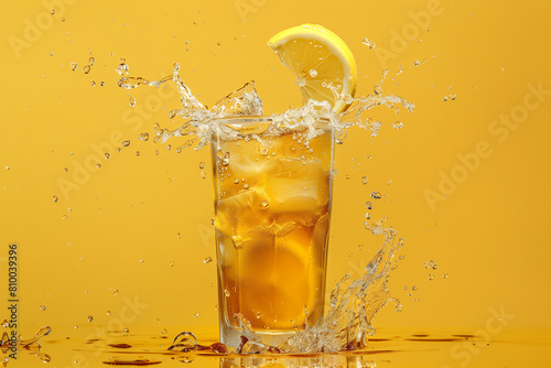 a close up of a glass of lemon tree splashing out of the top and on the outside of the glass with the yellow background