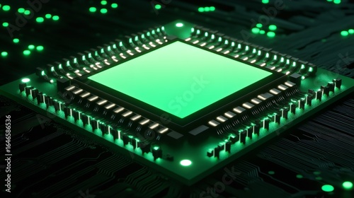 A close up of a green glowing computer chip with pins and circuits on a dark background design image