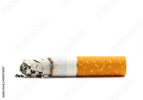 A close up of a partially burnt cigarette with ash against a plain white background in studio shot