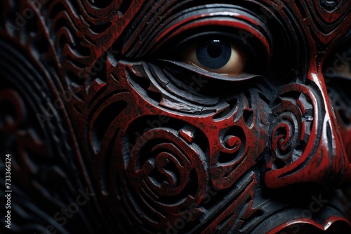 A close up of a person's face with a red and black design. Can be used for makeup inspiration or artistic concepts