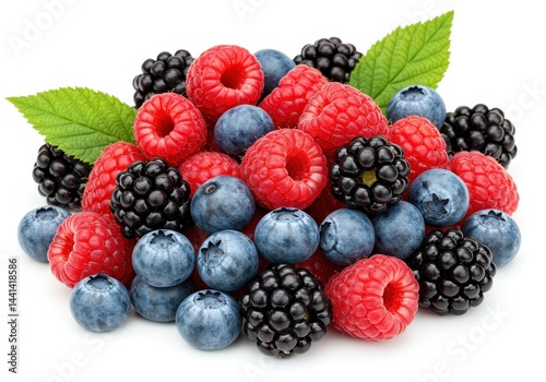 A close up of a pile of mixed berries including raspberries blueberries and blackberries on white background