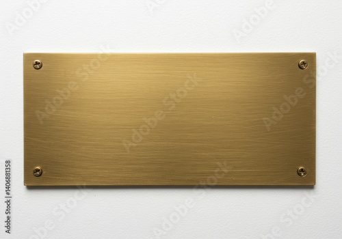 A close up of a rectangular brass plate attached to a white wall with four screws visible
