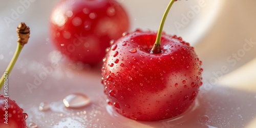 A close up of a red cherry with droplets of water on it