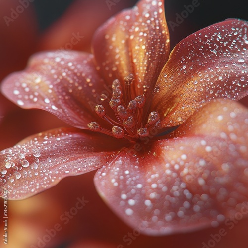 A close up of a red flower with water droplets