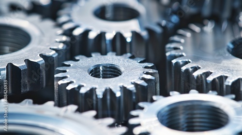 A close up of a set of gears with one of them having a hole in the middle. The gears are all silver and appear to be part of a larger machine. Concept of precision and complexity