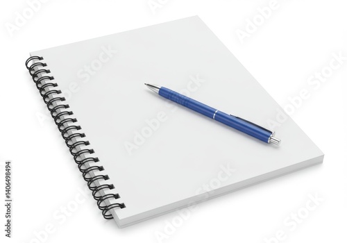 A close up of a spiral notebook with blank white pages and a blue pen resting on the top page surface