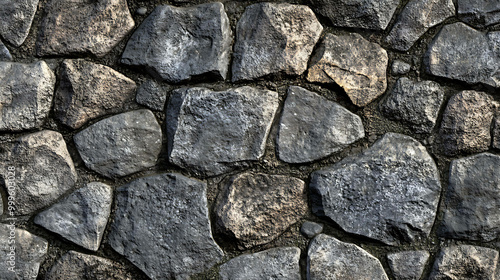 A close up of a stone wall, showing the rough texture of the stones and the uneven gaps between them.
