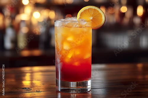 A close up of a vibrant layered tequila sunrise with a citrus twist served in a tall glass