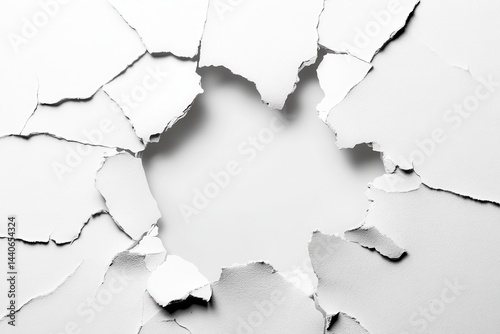 A close up of a white wall with a large hole broken through it revealing the surface beneath