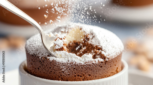 A close up of chocolate souffle with dusting of powdered sugar, showcasing its rich texture and inviting appearance. delicate dessert is perfect for indulgence and celebration
