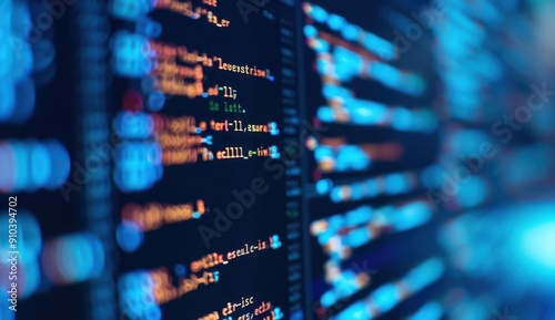 A close up of computer code on the screen, with dark blue and white colors, representing technology and coding in software development Generative AI