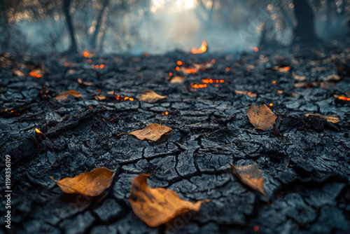 A close up of dry cracked soil with burnt leaves, symbolizing nature destruction from wildfire. Smoke creates hazy backdrop
