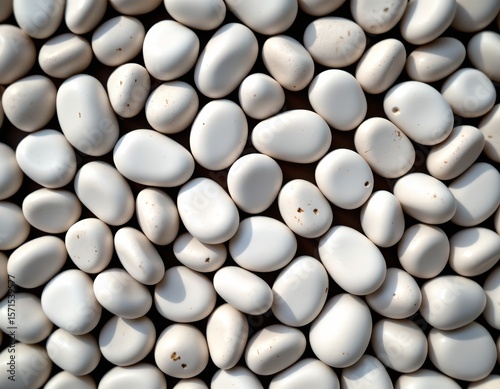 a close up of numerous white pebbles, which appear to be small stones or marbles, arranged in a grid pattern on a flat surface, creating a s