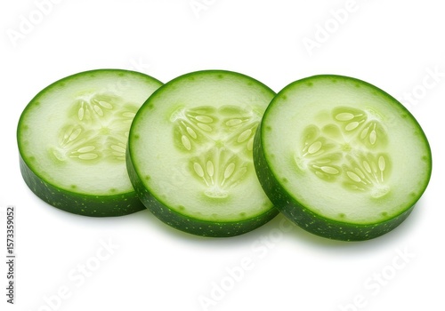 A close up of three fresh cucumber slices arranged on a plain white surface in a studio setting