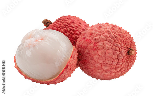 A close up of three lychee fruits with one peeled showing the white flesh on a black background