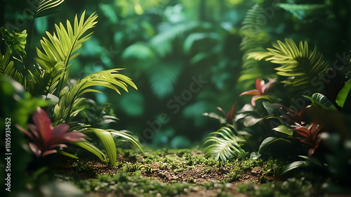 A close up on the ground of a jungle, A lush green fern in a tropical forest.
