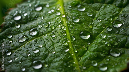 a close up photo of raindrops resting on a green leaf. The water droplets shimmer in the sunlight and create a beautiful, textured pattern.
