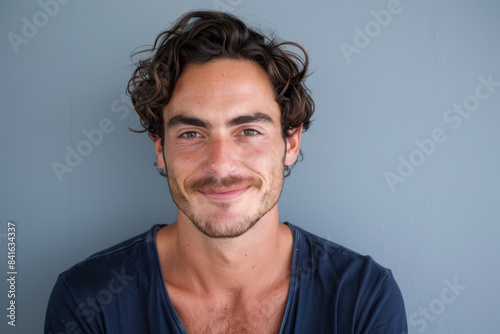 A close up portrait of a young man with a subtle smile