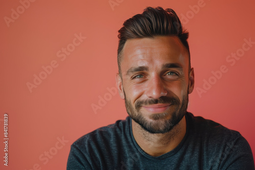 A close up portrait of a young man with a subtle smile