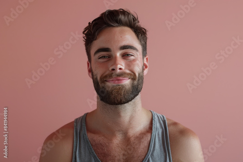 A close up portrait of a young man with a subtle smile