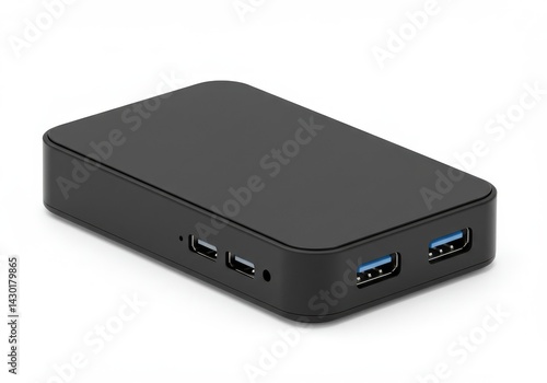 A close up shot of a black rectangular hub with multiple ports on a white background surface view