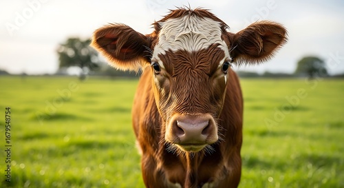 A close up shot of a brown and white cow standing in a green field looking directly at the camera
