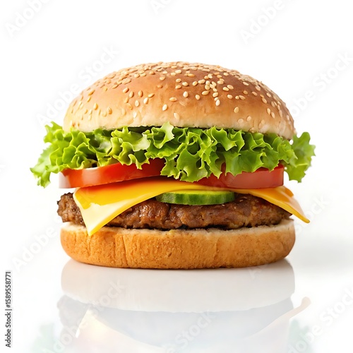 A close up shot of a hamburger with lettuce tomato cheese and cucumber on a white background surface