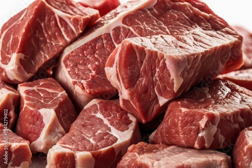 A close up shot of raw meat pieces stacked showing the marbling and texture on a white background