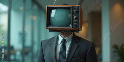 A close up, surreal portrait of a businessman standing confidently with a retro television set instead of a head