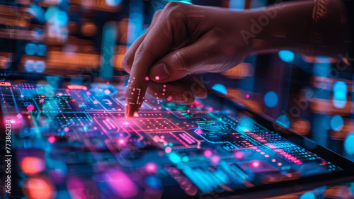 A close up view of a hand interacting with a high-tech digital touchscreen panel, illuminated with vibrant light.