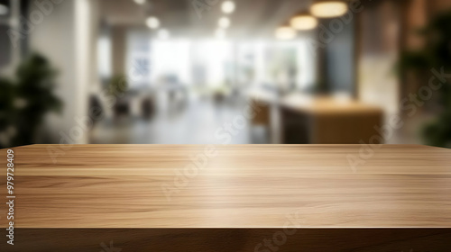 A Close Up View of a Light Brown Wooden Table Top in Front of a Blurred Background of a Modern Office Setting, Providing a Mockup for Displaying Products or Text