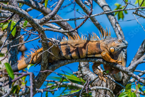 A close up view of a male iguana in a tree on the banks of the Belize River in Belize on a sunny day