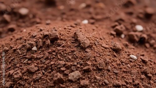 A close up view of a pile of reddish brown soil with small rocks and pebbles scattered throughout it