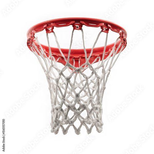 A close up view of a red basketball hoop with a white net on a white background