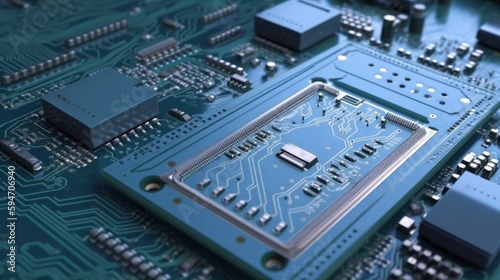 a close up view of an electronic circuit board hardware, schematic pcb illustration, micro chip core, capacitor printed ai computer, light indigo and green, generative ai