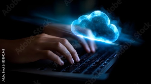 A close up view of hands typing on a laptop keyboard with a glowing blue holographic cloud icon floating above the screen representing the digital transformation and cloud computing